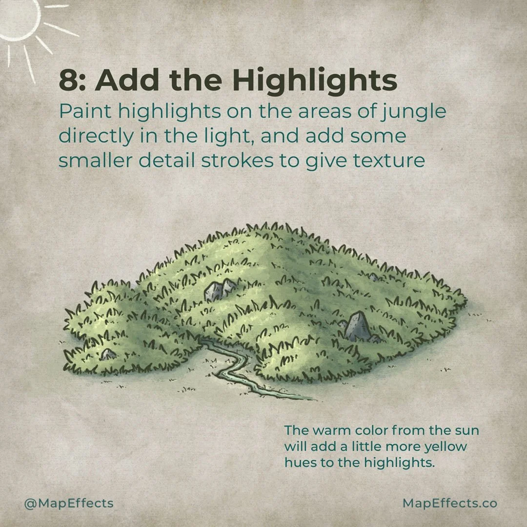 First, select the direction of your light source and where it will be hitting your jungle. You can then broadly paint in some simple shadows to begin giving it some dimension. Don't get lost in detail at this point, focus on the big things and not individual tree tops.